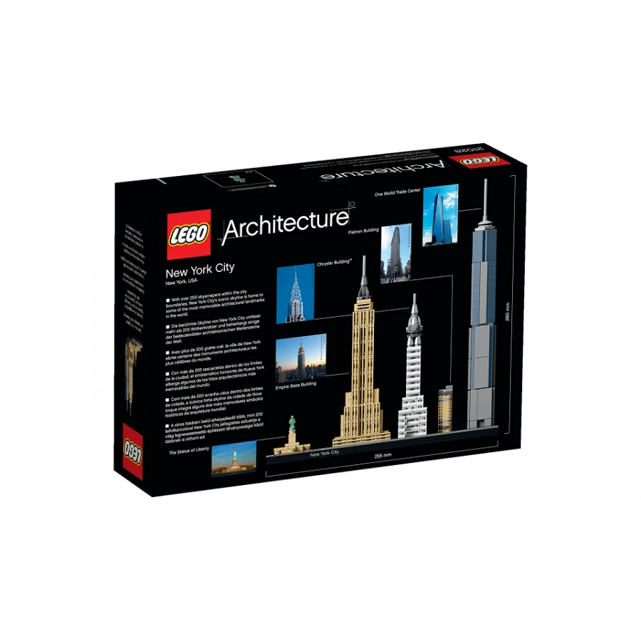 Zachyť architektonickou podstatu New Yorku s touto úžasnou sadou, která obsahuje ikonickou budovu Flatiron, budovu Chrysler, Empire State Building, věž světového obchodního centra a Sochu svobody, jenž tvoří krásnou scenérii. Každá LEGO® budova je navržena tak, aby poskytla výjimečný a prospěšný stavitelský zážitek díky barvám, jako ve skutečnosti, a díky stejnému měřítku pro všechny budovy. Tento úžasný model se zaměřuje na krásnou architektonickou rozmanitost jednoho z nejdynamičtějších měst na světě.