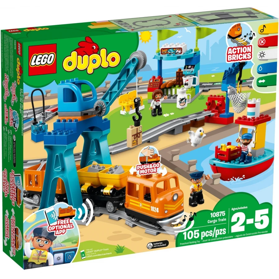 LEGO® DUPLO® 10875 Nákladní vlak je díky snadnému ovládání a spoustě interaktivních prvků vhodný i pro ty nejmenší. Děti se mohou stát strojvedoucím vláčku s motorem s technologií Push & Go – vláček lze uvést do chodu jemným postrčením dopředu nebo dozadu a zastavit přidržením nebo zvednutím z kolejí. Pomozte jim umístit na koleje 5 barevných akčních kostek, díky kterým vláček houká, rozsvěcuje a zhasíná světla, zastavuje pro doplnění paliva, mění směr jízdy a zastavuje, kdekoliv je libo. Sada Nákladní vlak od LEGO® DUPLO® obsahuje přístav, loďku, kavárnu, stanici určenou k nakládání nákladů, 2 jeřáby, 3 DUPLO figurky, figurku zvířátka a spoustu suprových kolejí, díky nimž nabízí spoustu klasické zábavy na kolejích. Stáhněte si doplňkovou aplikaci a získejte tak množství dalších herních možností, včetně dálkového ovládání a spousty zábavných aktivit pro nejmenší!