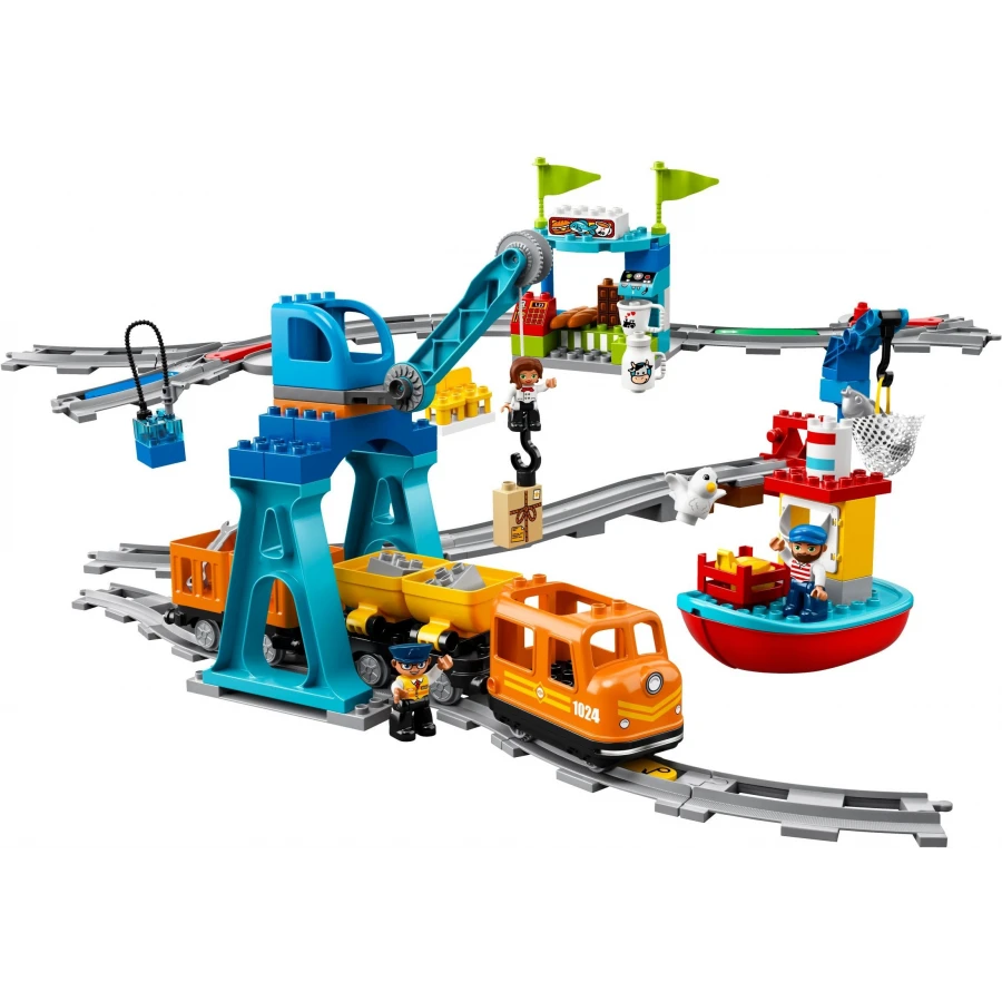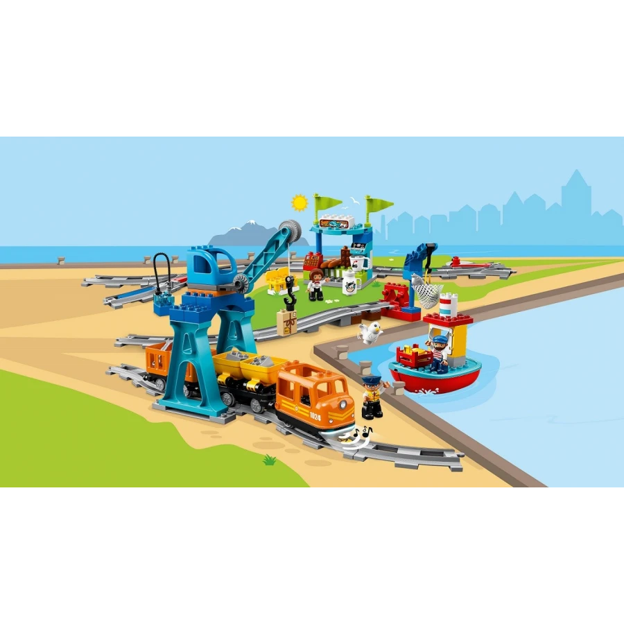• Obsahuje sestavitelnou lokomotivu s technologií Push & Go, která svítí a vydává zvuky, 2 nákladní vagóny s funkcí naklápění, 5 barevně rozlišených akčních kostek, přístav s malým jeřábem a loďkou, větší jeřáb, stanici určenou k nakládání/vykládání nákladů a 24 dílů kolejí, včetně výhybek, kopců, přejezdů a zastávek.