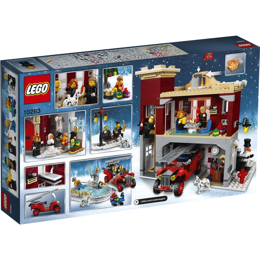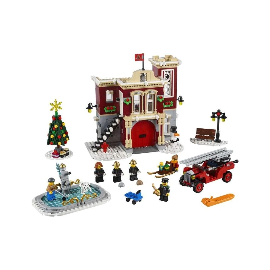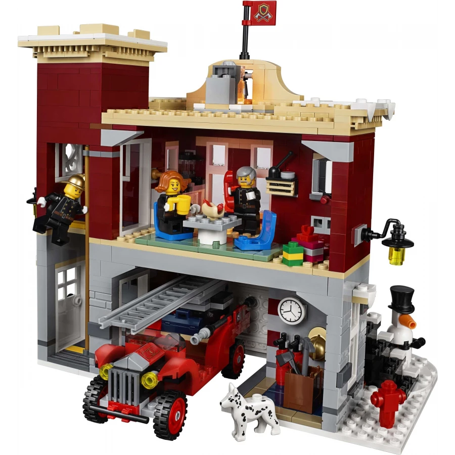 2patrová hasičská stanice obsahuje spoustu detailů z kostek, včetně propracované fasády se zdobenými sloupy a okny, a obrovská červená garážová vrata. Součástí sady je navíc i kluziště se sochou hasiče, ozdobený vánoční stromek s průsvitnou hvězdou, sáňky, lavička a pouliční lampa.